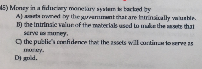 For example bankers lawyers and managers of public companies are trustees which means that they must act in the interests of their clients clients or shareholders. The first coin was minted in 650 BC by King Aliatte II. C fiduciary monetary standard exists D monetary union is necessary 45 Money in a fiduciary monetary system is backed by A gold.