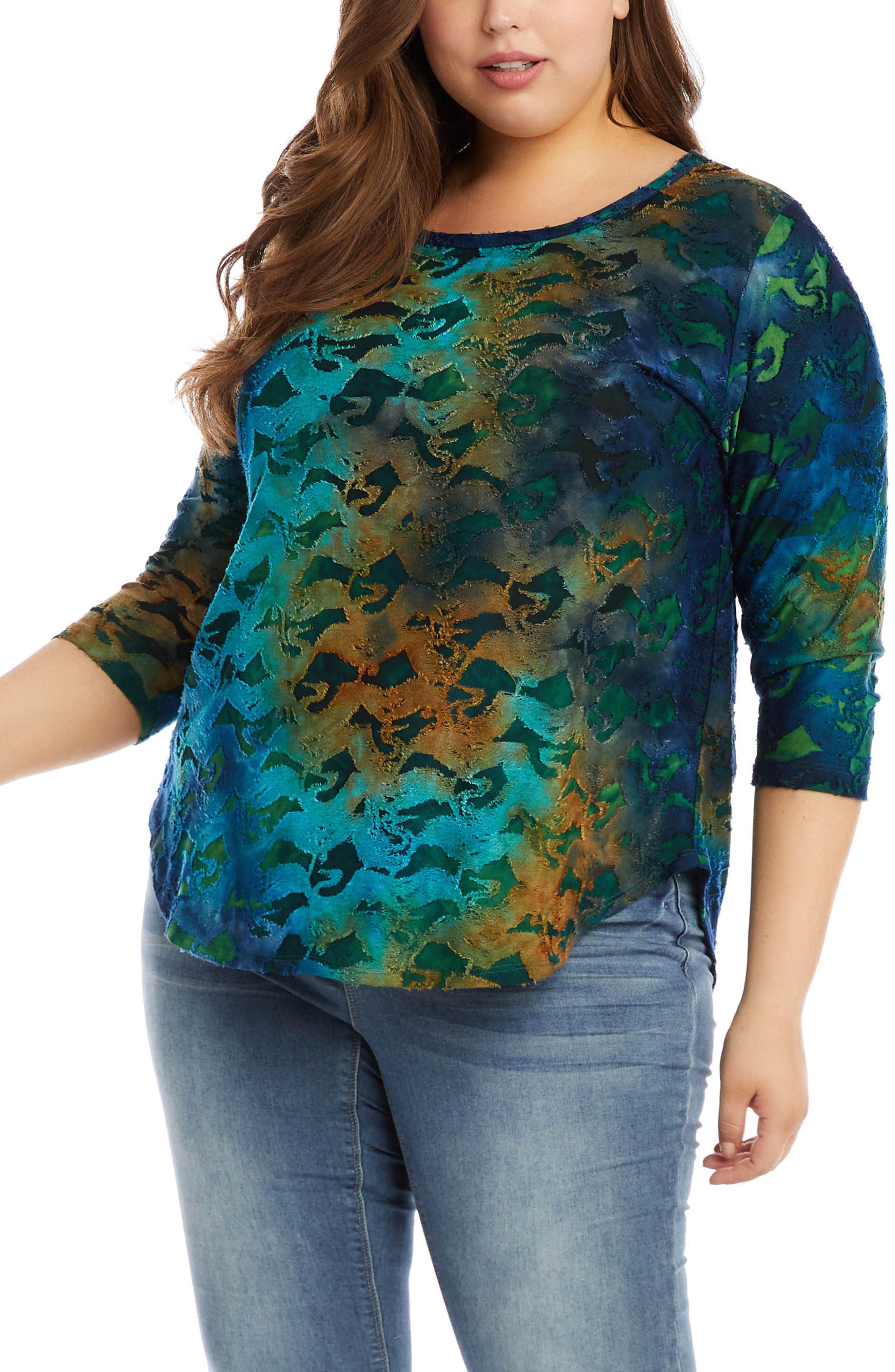 25 inches size M 100 Cotton. Includes a front slit for easy movement. Textural beauty is found in this Karen Kane jacquard top covered in an alluring scroll tie-dye design.